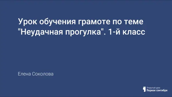 Разработка содержит подробный конспект урока обучения грамоте в 1-м классе. Цель: продолжить закреплять наглядно-образное представление о содержании и структуре текста; знакомить детей с временной последовательностью событий, описанных в рассказе «Неудачная прогулка»; формировать первичное наглядно-образное представление о словах-действиях. Урок развивает фонематический слух, произвольное внимание, логическое мышление, связную речь; прививает интерес к предмету.