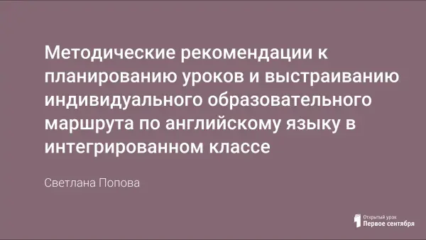 В статье даются методические рекомендации по планированию уроков в интегрированном классе, где, наряду с детьми "нормы", обучаются дети с ограниченными возможностями здоровья. Также даются рекомендации по выстраиванию индивидуального образовательного маршрута по английскому языку в интегрированном классе.