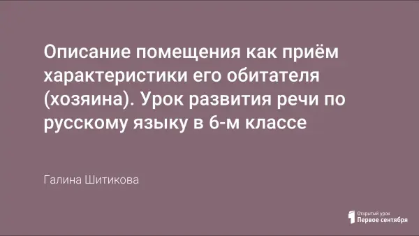 На уроке автор учит учащихся описанию помещения, его внутреннего пространства, характеризуя его обитателя; идет формирование учебных умений и навыков через составление текста описания помещения; развитие речи и мышления учащихся. Знакомство со словом "интерьер", с основными видами интерьера. Урок готовит учеников к самостоятельному составлению текста, с целью ввести в описание помещения "говорящие детали", чтобы можно было увидеть и понять героя.