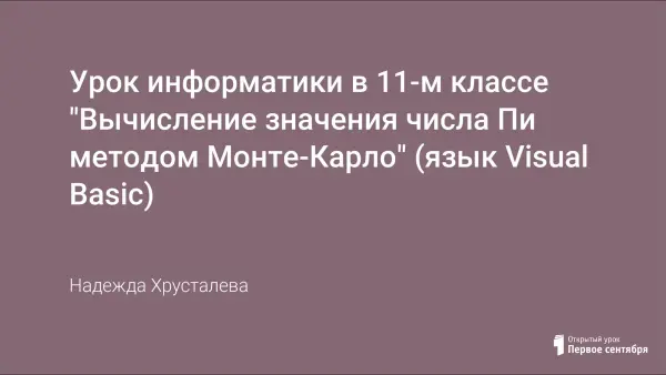 Урок был проведен в 11-м физико-математическом классе 14 марта в неофициальный праздник – День числа Пи. Урок знакомит с методом вычисления площади фигур неопределенной формы. Учащимся предлагается найти значение числа Пи, используя объектно-ориентированную среду Visual Basic.