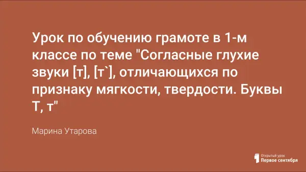 Урок призван научить дифференцировать звуки [т ] [т’] по твёрдости-мягкости и сравнивать их с соответствующей парой звонких звуков [д ] [д’]. Также он учит приёму практического определения звонкости-глухости изучаемых звуков, тренирует учеников в чтении слогов, слов и текстов, развивает фонематический слух и культуру звукопроизношения. У детей обогащается словарный запас, развиваются коммуникативные навыки, умение работать в паре, в группах.