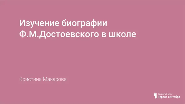 В современной школе изучению творчества Ф.М.Достоевского отводится скромное место. В 8-м классе предлагается для изучения одно из его ранних произведений – «Белые ночи» или «Бедные люди», в 10-м классе - социальный, психологический и философский роман «Преступление и наказание». Чтобы ответить на вопросы, возникающие при прочтении произведения, начинать изучение творчества писателя в 10-м классе следует с тщательного знакомства обучающихся с биографией писателя, которую предлагается изучать в виде лекции с элементами беседы.
