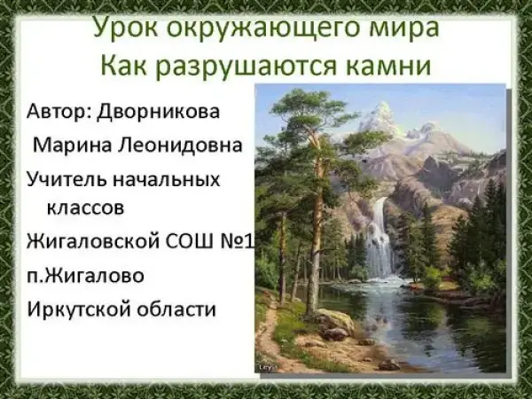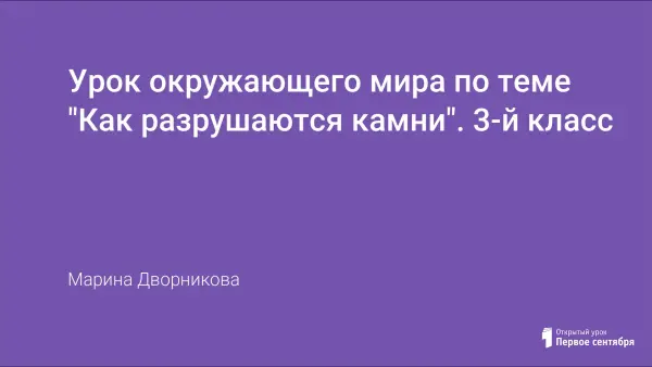 Урок соответствует тематическому планированию и относится к разделу курса «Окружающий мир». Материал урока опирается на знания учащихся, полученные на предыдущих уроках. На уроке формируется представление о разрушении горных пород под действием температуры воздуха, воды, льда, ветра, растений, животных.