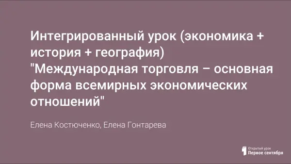Интегрированный урок способствует установлению межпредметных связей экономики, истории, географии. Урок построен на паритетных началах, на равном долевом участие обоих педагогов. На уроке рассматриваются вопросы: истории развития и становления международной торговли, причины её возникновения, вопросы регулирования международной торговли. Учащиеся знакомятся с основными показателями внешней торговли современной России и Камчатки. Проводят сравнительный анализ статистических данных.
