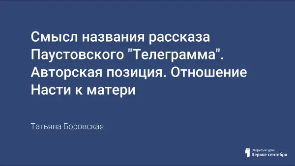 Рассказ «Телеграмма» дает замечательную возможность проследить за емкостью слова писателя, сосредоточиться на авторском «Я», выявляющем себя во всем многообразии взаимосвязей основных компонентов текста: в композиции, в отборе и внутреннем сцеплении эпизодов, в сопоставлении характеров, в речи персонажей, специфике деталей, интерьера и др. художественных средств.