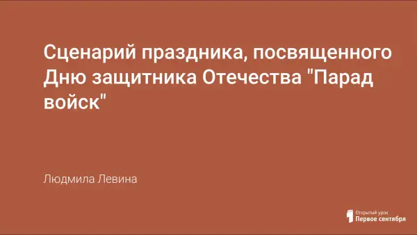 В разработке представлен сценарий проведения мероприятия ко Дню защитника Отечества в дошкольном учреждении в рамках нравственно-патриотического воспитания. Мероприятие носит интеграционный характер, где задействован весь педагогический коллектив, родители, участники локальных войн, телевидение. Дети знакомятся с проведением парада, с военными маршами, с военной техникой, с понятиями Отечество, Родина. Парад принимает «настоящий» командующий (папа одного из воспитанников).