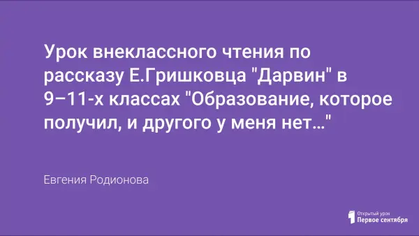 Урок внеклассного чтения знакомит старшеклассников с одним из самых ярких представителей современной литературы Евгением Гришковцом. Основной путь изучения – активная работа с текстом художественного произведения и материалами прессы. Урок может быть проведён как в 9-х так и в 10–11-х классах, поскольку в анализируемом рассказе «Дарвин» речь идёт о выборе будущей профессии.