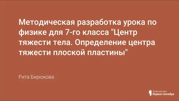 Урок физики представлен в виде компьютерной презентации. Данная тема в учебнике 7-го класса А.В. Перышкина дается в разделе для дополнительного чтения, а по программе должна изучаться. Урок изучения нового материала, лабораторная работа. Образовательные цели урока: раскрыть понятие центра тяжести тела, экспериментально подтвердить изученные теоретические знания.