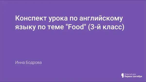 Этот урок по теме «Food» проводится в 3-м классе (второй год обучения) и является итоговым после изучения темы. Урок проводится между двумя группами одного класса, на которые ученики поделены для изучения английского языка. В течение урока ученики отгадывают загадки, читают стихи, поют песни, узнают об английском и русском чае. Завершается этот урок чаепитием.