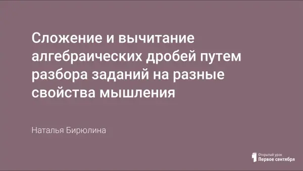 На уроке по теме "Сложение и вычитание алгебраических дробей" проводится систематизация знаний обучающихся, которая осуществляется путем разбора заданий на разные свойства мышления. Таким образом, формируется положительная "Я"-концепция обучающихся. Развивается интерес к самопознанию, воспитывается позитивное отношение к изучению предмета.