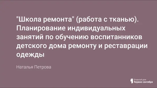 Данная работа содержит тематическое планирование курса "Школа ремонта". Задачи: научить элементарным швейным приемам, работе на швейной машине и применять эти умения при ремонте одежды; развивать точность и аккуратность мелкую моторику, творческие способности; воспитывать чувство ответственности и бережного отношения к своей одежде. Занятия проводятся для мальчиков и девочек 1 раз в неделю, с каждым ребенком индивидуально.