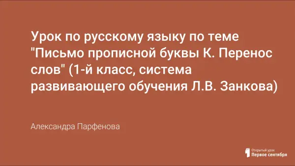 Урок русского языка по теме "Письмо прописной буквы К. Перенос слов" учит писать прописную букву К, закрепляет знания о видах соединения букв при письме, учит соединять прописную К с другими буквами.