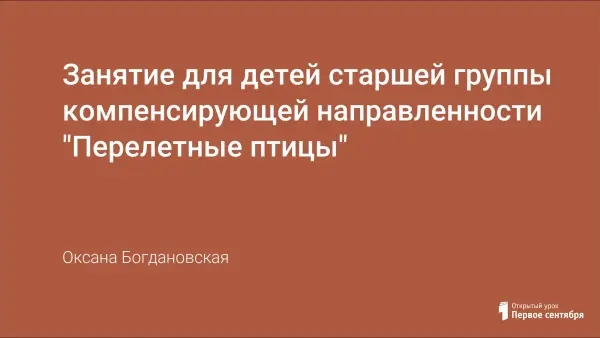 Занятие направлено на уточнение и расширение знаний о перелетных птицах у детей старшей группы компенсирующей направленности, формирование понятия "перелетные птицы", знакомство с жизнью разных птиц (гнездование, выведение птенцов, корм птиц), на формирование у детей экологической культуры и бережного отношения к природе.