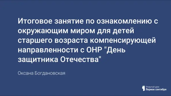 Занятие направлено на закрепление представлений детей старшего возраста компенсирующей направленности с ОНР об армии, о родах войск, их назначении; на развитие мышления, памяти, внимания, стимулирование речевой активности детей; на воспитание уважения к защитникам нашей Родины, чувства гордости за свою армию, желание быть похожими на сильных и смелых российских воинов.