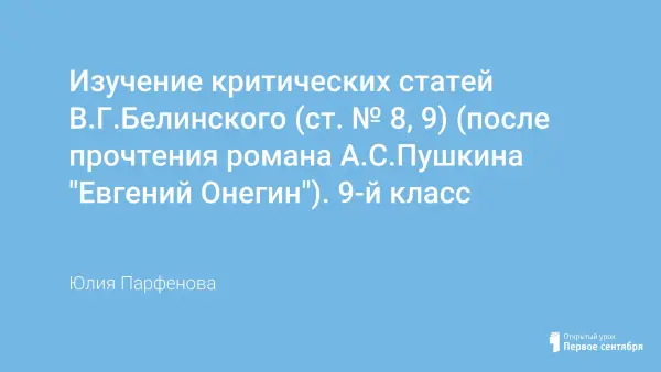 Цели урока: познакомить учащихся с критическими статьями В.Г.Белинского; совершенствовать навыки творческого, исследовательского восприятия материала, работы с источником дополнительной информации по предмету, умению правильно и лаконично строить ответ, выделять главное, сопоставлять факты, делать выводы, высказывать свое мнение; способствовать развитию логического мышления путем проблемных вопросов; вызвать интерес к внимательному чтению произведений Пушкина и к его эпохе.