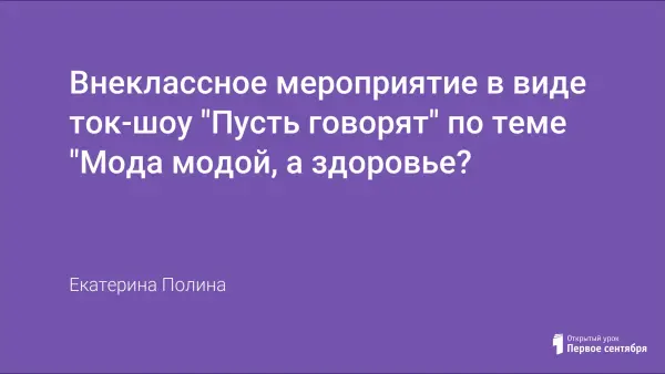 Цель мероприятия: повысить интерес у учащихся к предмету; привлечь внимание учащихся к проблемам современной молодежной моды и связанными с ней медицинскими проблемами; развить информационные умения – умение работать с различными источниками информации, осуществлять переработку научной, научно-популярной, художественной литературы.