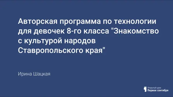 Цель программы: нравственно-эстетическое развитие школьников на видах декоративно-прикладного творчества и истории костюма народов Ставропольского края.