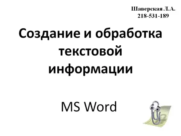 "Создание и обработка текстовой информации MS Word". 7-й класс