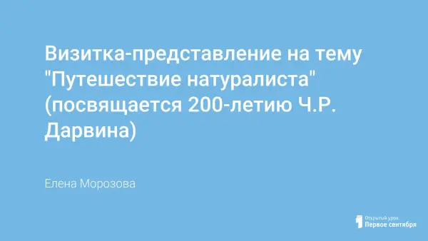 Сценарий визитки-представления был посвящён к 200-летию со дня рождения великого учёного-биолога Чарльза Роберта Дарвина. Этот сценарий можно использовать как во внеклассной работе, так и как нестандартный урок в качестве обобщения знаний по теме «Эволюционное учение».