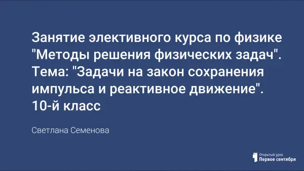Занятие элективного курса закрепляет знания при изучении темы «Импульс тела. Закон сохранения импульса». В ходе урока совершенствуются навыки решения типовых задач с алгоритмами, составления условия и решения задач с учетом теоретических знаний и показывается применение закона сохранения импульса для реактивного движения.