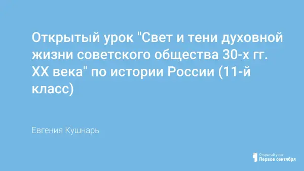 Содержанием материалов является план открытого урока для слушателей областных курсов ИППК Амурской области в разделе «Духовная жизнь советского общества 1930-х гг. XX века». Ход урока не является традиционным, а предполагает предварительную подготовку учащихся и их готовность высказывать свои суждения по вопросам духовной жизни советских людей соответствующего периода.