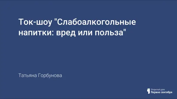 Представленная разработка может быть использована в 7–11-х классах. Она направлена на профилактику алкоголизма. В данном мероприятии ребята в доступной форме по принципам "равный–равному" получат информацию об истории происхождения алкоголя и слабоалкогольных напитках, разберутся с мифами об алкоголе, узнают его состав, о вреде и пользе, наносимые организму.
