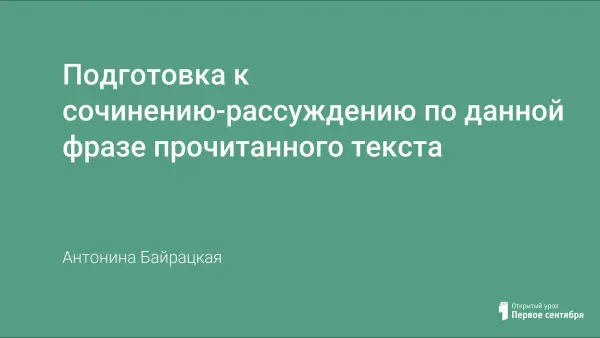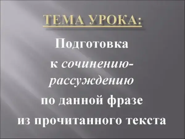 Материал урока дает возможность учащимся отработать технологию написания сочинения по заданной фразе прочитанного текста (задание типа С2.2). Они поймут, что этот тип работы требует от них знаний структуры написания сочинения-рассуждения. Кроме того, учащиеся в ходе составления алгоритма действий получат четкую установку, в какой последовательности они должны строить свою работу с текстом, чтобы понять его содержание, тему и основную мысль.