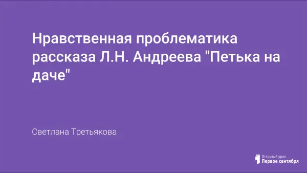 Урок ознакомления с новым материалом, в процессе которого учащиеся знакомятся с личностью Л.Н. Андреева, особенностями его стиля, отвечают на проблемный вопрос: «Описанию жизни героя на даче посвящена меньшая часть повествования. Почему же свой рассказ Л.Н. Андреев назвал «Петька на даче»?» Рассматривая основные нравственные проблемы, поднимаемые автором (безрадостное детство, отсутствие чуткости), ребята учатся доброте, состраданию. Используются методы проблемного обучения.