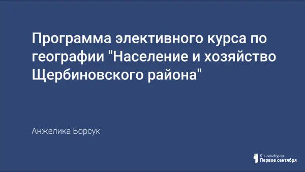 Программа элективного курса в рамках предпрофильной подготовки по географии (9-й класс, 17 часов) формирует у учащихся знания о родном районе и подводит к пониманию своего места в районе (станице). Ученики самостоятельно изучают особенности экономической географии своей местности с помощью специально организованных наблюдений, экскурсий, проживают явления культуры и экономики, пропуская их через собственное творчество. Программа рассчитана на учащихся, которые интересуются историей, географией, культурой, краеведением, экономикой.