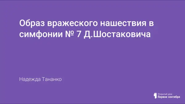 На уроке дети знакомятся с симфонией № 7 Д.Шостаковича, характеризуют образы вражеского нашествия и средства музыкальной выразительности, с помощью которых создан образ. Также выявляют взаимосвязи музыкального произведения с произведениями изобразительного искусства и поэзии. В конце урока дети разучивают песню Н.Тананко «Память о войне».