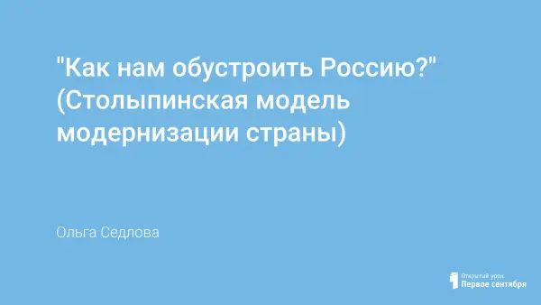 Урок знакомит учащихся с ходом столыпинских аграрных реформ, подводит к пониманию причин, по которым они назрели. В начале урока учитель определяет проблему, над которой предстоит работать, подводит учащихся к мысли о том, что решение аграрного вопроса являлось одним из главных в России начала XX в. К данному уроку учащиеся готовят мини-проекты по наиболее острым вопросам темы. В конце подводятся итоги реформы, выявляется роль личности Столыпина в отечественной истории.