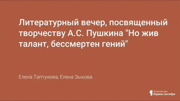 Литературный вечер для учащихся 8–9-х классов посвящен творчеству А.С. Пушкина. Он знакомит учащихся с тем, как современные поэты по-своему прочитывают страницы жизни А.С. Пушкина; учит школьников размышлять над поэтической строкой; вызывает в сердцах детей чувство соучастия к судьбе Пушкина; пробуждает интерес к современной поэзии о Пушкине; способствует эстетическому воспитанию учеников.