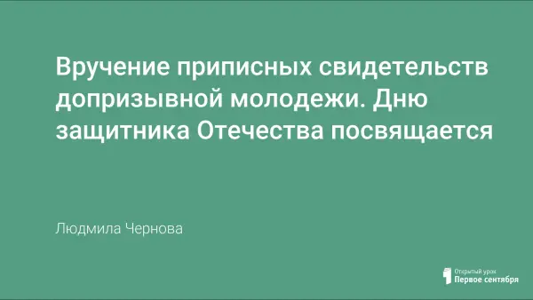 Внеклассное мероприятие посвящено Дню защитника Отечества, который отмечается вручением приписных свидетельств допризывной молодежи. На мероприятии присутствуют: ветераны войны, военнослужащие срочной службы, представители военкомата, педагоги школы, учащиеся старших классов, родительская общественность.