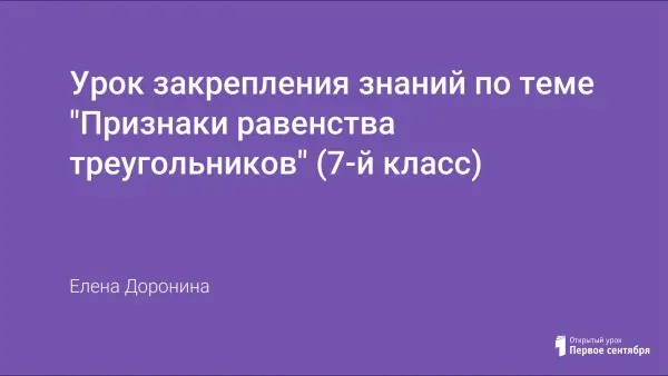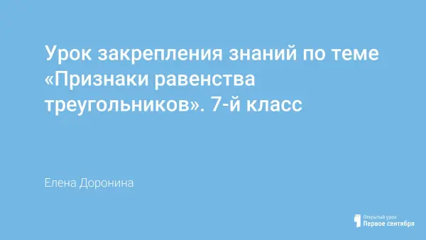 Обобщающий урок в 7-м классе, посвященный закреплению знаний признаков равенства треугольников, умению применять их при решении задач. Воспитывает чувство товарищества и взаимопомощи, развивает внимание, умение проводить анализ работ. Повышает интерес к геометрии.