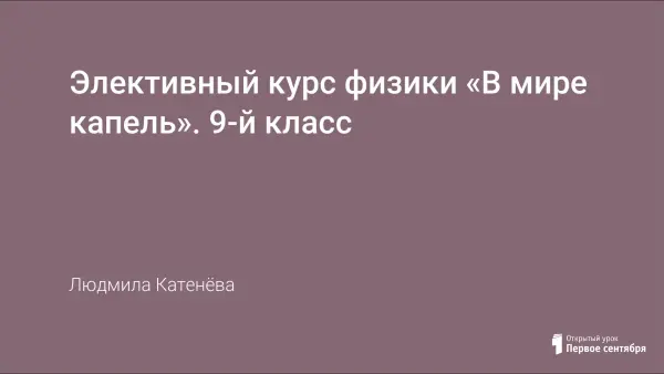 Преподавание физики в гимназии гуманитарного направления имеет свою специфику и особый колорит. Цель статьи и презентации состоит в демонстрации особенности гуманитарной физики сквозь призму внеурочной работы в виде элективного ориентационного курса «В мире капель». Программа предназначена для учащихся 9-х класса, выбирающих дальнейший профиль обучения в старшей школе. Цель элективного курса: создание ориентационной основы для выбора естественно-научного профиля обучения.