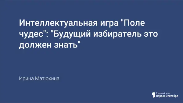 Методическое пособие представляет собой внеклассное занятие в форме капитал-шоу «Поле чудес». На занятии учащиеся закрепляют основные понятия по избирательному праву, у них формируется первичное представление о необходимости участия в политической жизни общества.