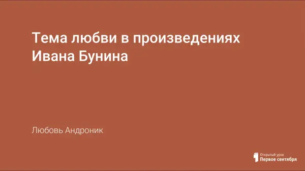 На занятии учащиеся знакомятся с произведениями Ивана Бунина любовной тематики; своеобразием рассказов, новизной в изображении психологического состояния человека; неоднозначностью трактовок рассказов.