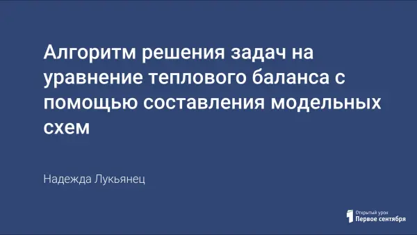 Алгоритм решения представлен в презентации на примере решения одной из задач на уравнение теплового баланса. Показан способ создания модельной схемы происходящих процессов. Презентация предназначена для самостоятельной работы учащихся, повторения темы «Термодинамика», подготовки к ЕГЭ по физике.