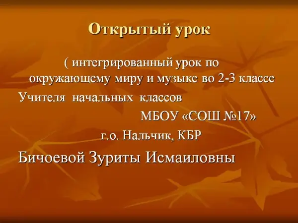 Цель урока: повторить и закрепить характерные признаки осени; дать представления об основных изменениях в живой и неживой природе, их связи; дать краткую информацию об известных композиторах-классиках, познакомить с произведениями, музыкальными инструментами, которые используются при исполнении произведений; расширять кругозор детей; воспитывать любовь к природе и музыке.