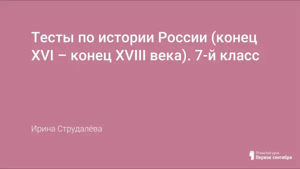 Тестовый контроль может оценить уровень учебных достижений: качество и уровень усвоенных знаний, развитие определенных навыков и приобретение требуемых умений. В настоящей работе представлены различные виды тестовых заданий по курсу истории России с конца XVI до конца XVIII в. Разработано несколько вариантов каждого из видов тестовых заданий, что позволяет организовать эффективную работу учеников. Тестовые задания могут быть использованы учителем для текущего, тематического и итогового контроля.