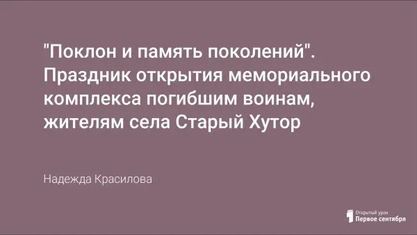 Сценарий праздника, который состоялся в селе Старый Хутор, посвящённый открытию Мемориального комплекса в память о не вернувшихся с войны. Задача мероприятия: формирование нравственного отношения к историческому героическому прошлому России, чувства гражданской ответственности за настоящее и будущее страны и народа.