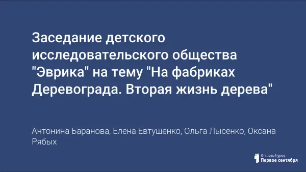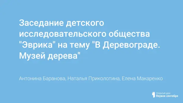 Данное мероприятие – это одно из заседаний детского исследовательского общества «Эврика» в начальной школе. В ходе его проведения дети расширили свои знания о применении дерева человеком; познакомились с работой мастеров, изготавливающих музыкальные смычковые инструменты; осознали значимость использования людьми первых деревянных кукол; убедились в том, что пряничные доски являются памятниками русской народной культуры, а также научились делать кулон из спила сухого дерева и кусочка шпагата.
