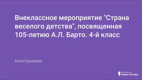 Цель внеклассного мероприятия: познакомить учащихся с биографией А. Л. Барто. Показать учащимся ее талант как писателя, поэта, публициста, переводчика, общественного деятеля; расширить кругозор детей.