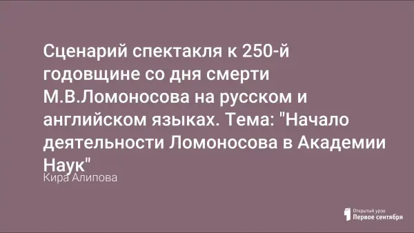 Сценарий спектакля на английском языке подготовлен к 250-летию со дня смерти М.В. Ломоносова. Русский вариант текста прилагается.
