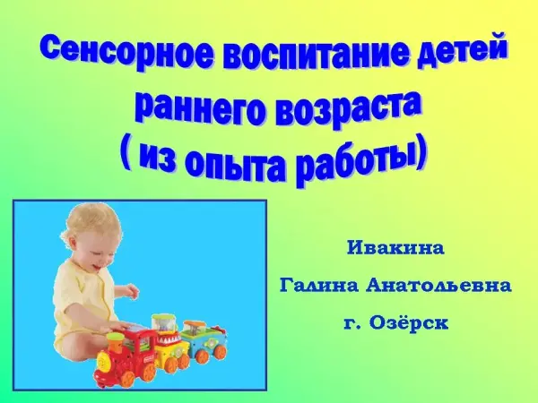 Работа содержит презентацию и выступление по теме «Сенсорное воспитание детей раннего возраста». Выступление и слайды презентации помогают охарактеризовать особенности системы сенсорного воспитания, показать важность развития у детей раннего возраста сенсорных процессов, определить программные требования к обучению детей раннего возраста, выявить результативность обучения детей раннего возраста по программе сенсорного воспитания, проанализировать достижения детей раннего возраста.