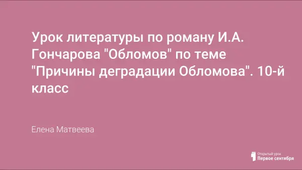 Урок формирует представления учащихся о причинах деградации главного героя романа, рассматривает внутренние и внешние факторы, которые влияют на становление его характера. Значительное время на уроке уделяется работе со словарем. Урок развивает умение внимательно читать текст, выделять детали описания. Ученики решают кроссворд по роману И.А. Гончарова.