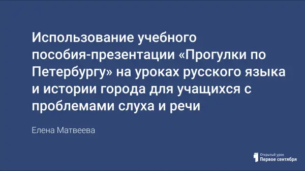 Презентация «Прогулки по Петербургу» является наглядным учебным пособием для учащихся с проблемами слуха и речи. Презентация используется на интегрированных уроках по истории города, развитию речи и русскому языку. На уроках русского языка слайды презентации применяют при изучении отдельных тем по орфографии и пунктуации. На уроках по истории города предлагается материал по истории Петербурга, учащиеся имеют возможность закрепить полученные знания, выполняя упражнения по развитию речи.