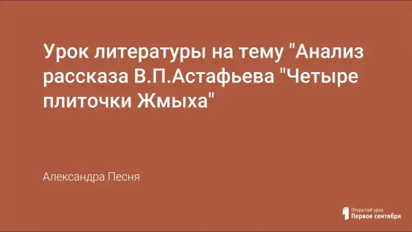 Цель урока: знакомство с жизнью и творчеством В.Астафьева. Анализ рассказа «Четыре плиточки жмыха» из сборника «Затеси» заставляет задуматься о назначении человека на земле и его нравственных устоях, формирует лингвистические и коммуникативные навыки учащихся, учит умению «видеть» и «слышать» писателя. В процессе работы идет повторение по теме «Причастие», совершенствуется практическая грамотность.