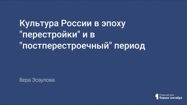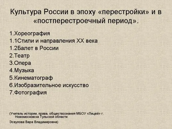 Цель работы: донести до учащихся информацию о достижениях в области культуры в эпоху «перестройки» и «постперестроечный» период; помочь учащимся сформировать объективное отношение к этому времени.