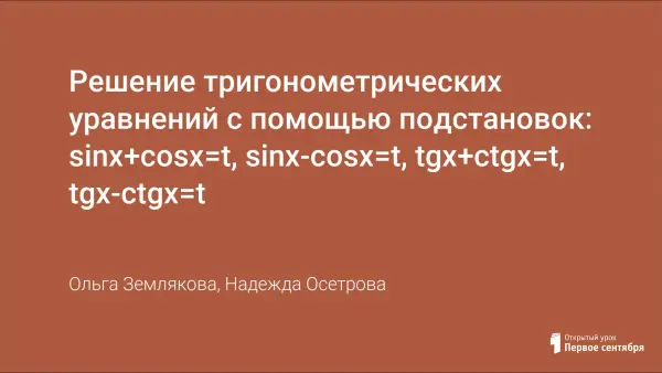 Решение тригонометрических уравнений с помощью подстановок: sinx+cosx=t, sinx-cosx=t, tgx+ctgx=t, tgx-ctgx=t